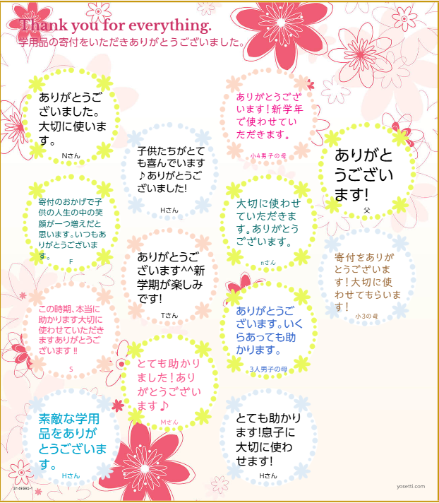 小学生から高校生までのお子様にたくさんの学用品をコミュニティフリッジ内でお配りしました。500名近いお子様に学用品をお配りすることができました。いつも応援してくださるご支援者様の皆様、たくさんの学用品の寄付をくださった皆様、本当にありがとうございました。学用品をお受け取りになられた方から色紙にメッセージを入力していただきました。今後も活動が続けられるよう、スタッフ一同尽力して参ります。今年もご支援・ご協力をどうぞよろしくお願いいたします